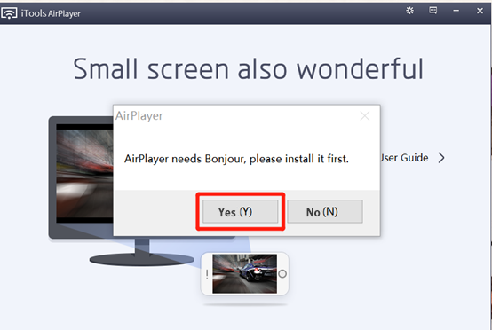 1.1 Download air player in your PC. The first time you open AirPlay, the system will pop up “requires Bonjour to excute AirPlayer, please download”, please choose YES. (AirPlayer is a paid product and can be used for free within 7 days.)Download address: https://www.thinkskysoft.com/airplayer/